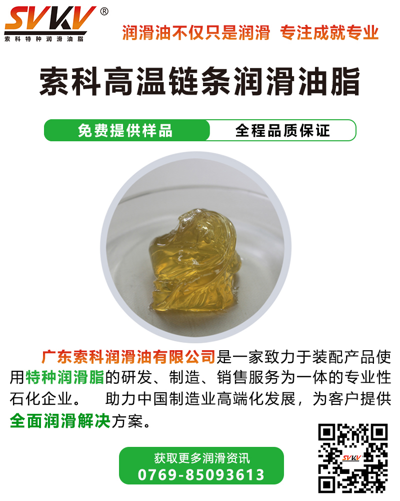 SVKV索科高溫鏈條油脂是以優(yōu)質(zhì)基礎油、添加抗氧、抗磨、防銹等添加劑調(diào)制而成。索科高溫鏈條油可承受極高溫,不易洗掉和燒毀受保護涂層,對金屬零件具有極好的防腐蝕、防磨損、防水、防銹等特性,在高溫下抗氧化不冒煙、不積碳、防止金屬燒結(jié)卡死的消音和長效潤滑作用。