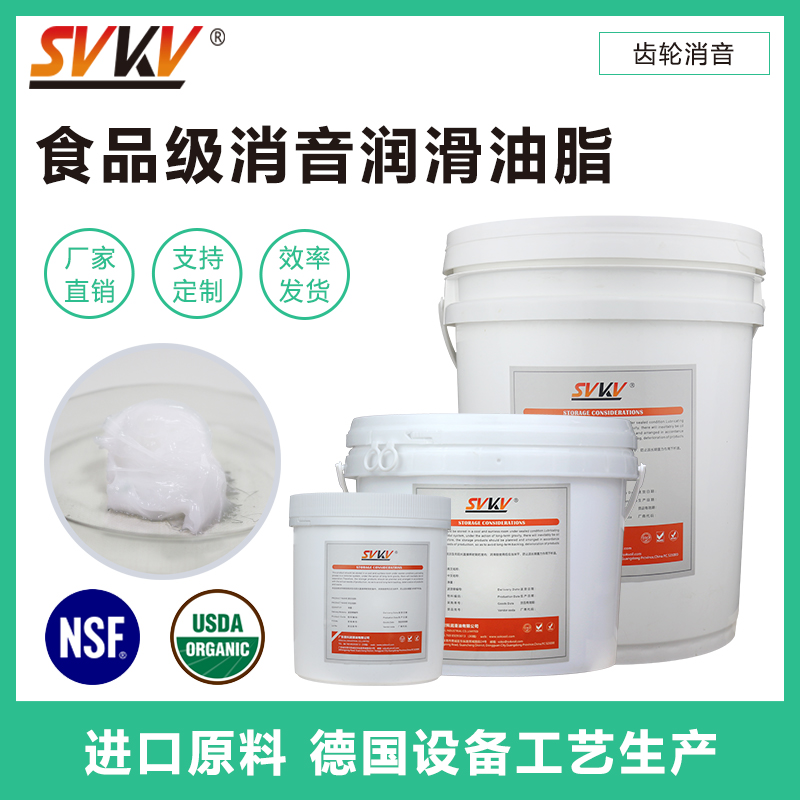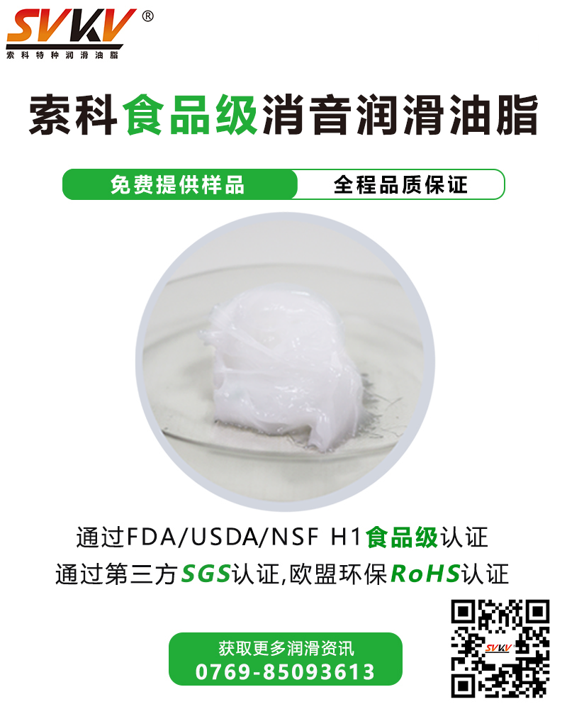 索科SVKV食品級消音潤滑油脂,選用食品級基礎油和無毒無害的添加劑精制而成,專為食品醫療設備所研制。索科SVKV食品級消音潤滑油脂符合美國FDA和USDA法規標準,并通過USDA/NSF-1食品級認證,保障設備產品的衛生安全。