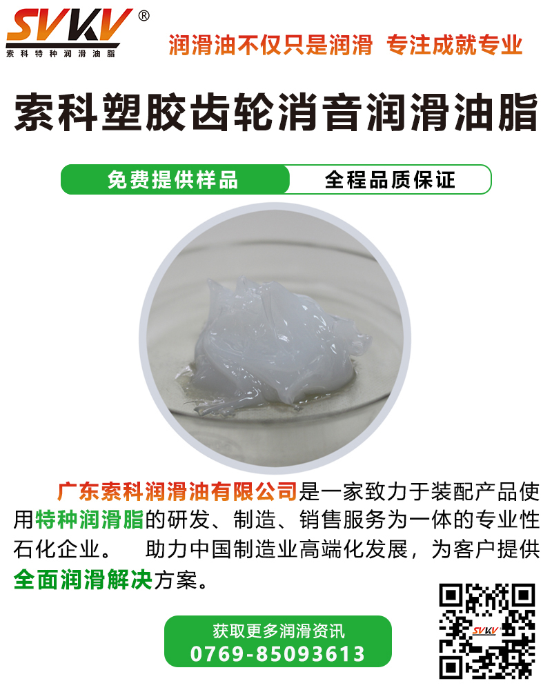 索科SVKV塑膠齒輪消音潤滑油脂選用高性能基礎(chǔ)油,并添加多種高效抗氧化、抗腐蝕等添加劑精制而成,是專為塑膠齒輪而研制。索科SVKV塑膠齒輪消音潤滑油脂能有效減少齒輪磨損,降低噪音,達(dá)到延長齒輪壽命的效果。